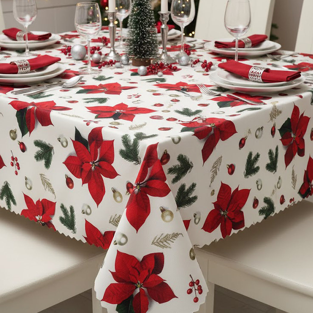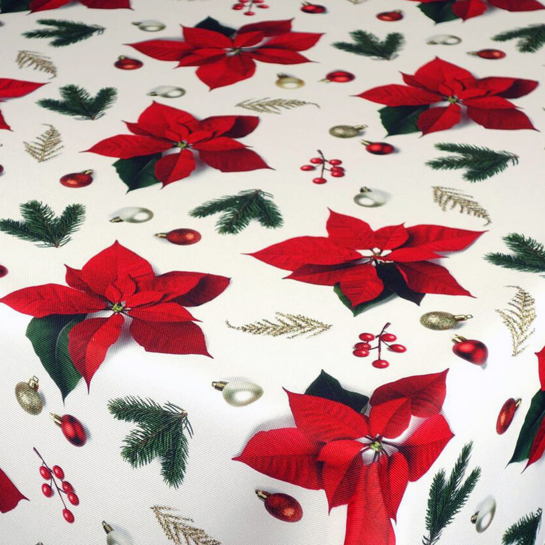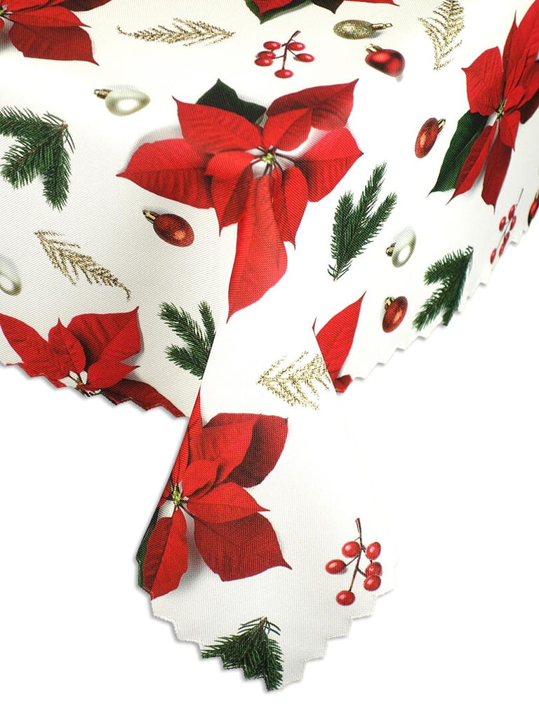 Elegancki wzór obrusu o klasycznej, świątecznej kolorystyce. Na jasnym, białym lub kremowym tle wyróżniają się duże, realistyczne kwiaty Gwiazdy Betlejemskiej (Poinsecji) w intensywnej czerwieni. Kwiaty te są splecione z zielonymi gałązkami jodły i ostrokrzewu, które wprowadzają naturalny, leśny akcent. Kompozycję dopełniają drobne, złote i czerwone bombki oraz akcenty, równomiernie rozmieszczone w tle. Wzór jest gęsty, ale jednocześnie uporządkowany, tworząc efekt obfitej i ciepłej dekoracji. Krawędzie obrusu wykończone są dekoracyjnym ząbkiem.