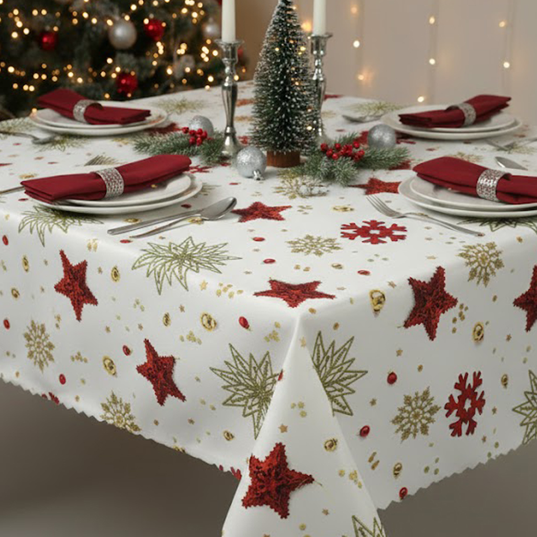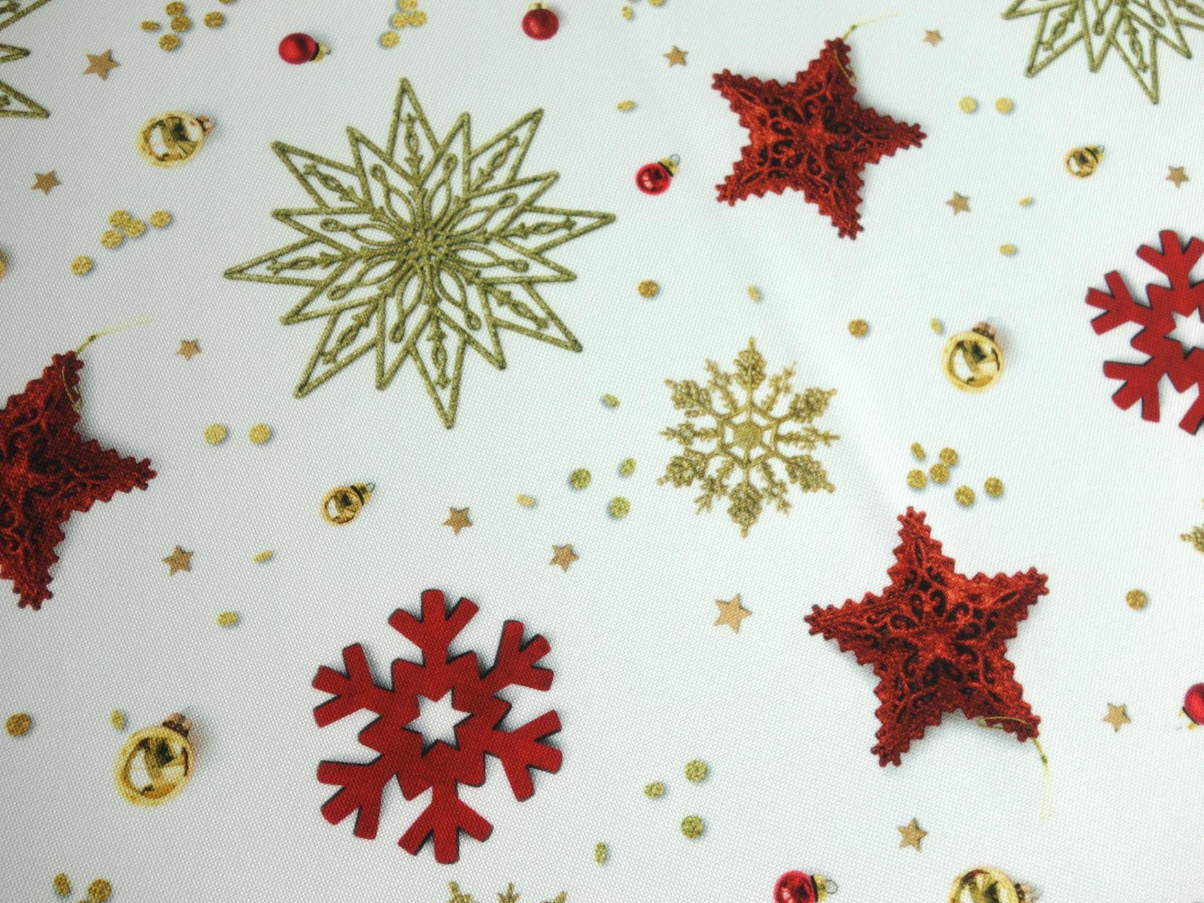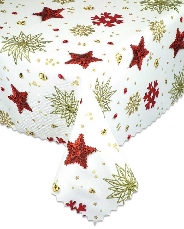 Jasny, świąteczny wzór o eleganckim i radosnym charakterze. Na śnieżnobiałym tle dominują stylizowane, czerwone gwiazdy o wyraźnej, teksturowanej powierzchni. Towarzyszą im mniejsze, złote, filigranowe gwiazdy i płatki śniegu, które nadają wzorowi szlachetny blask. Całość dopełnia subtelna posypka w postaci złotych dzwoneczków, kropel i drobnych akcentów, tworząc dynamiczną i mieniącą się kompozycję. Wzór jest rozmieszczony swobodnie i równomiernie. Obrus jest wykończony dekoracyjnym ząbkiem na całym obwodzie, podkreślającym jego świąteczny wygląd..