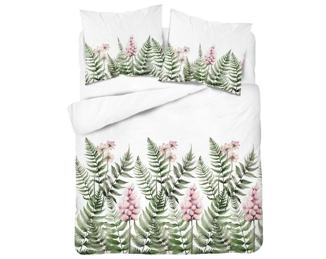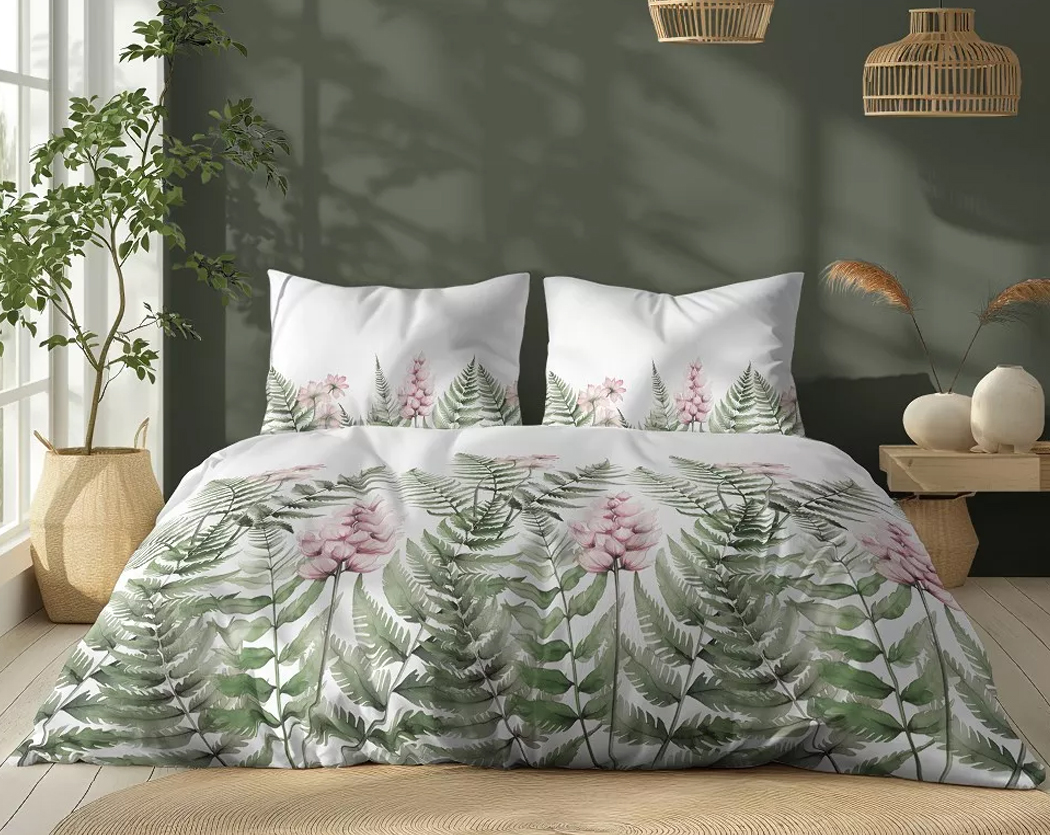 Design i kolorystyka: Na nieskazitelnie białym tle rozciąga się malowniczy pas roślinności. Motyw składa się z gęstych liści paproci w różnych odcieniach zieleni oraz subtelnych, jasnoróżowych kwiatostanów przypominających łubin lub lilie. Wzór koncentruje się w dolnej części poszwy, pnąc się ku górze i pozostawiając górną partię kołdry czystą i białą, co nadaje całości lekkości i elegancji.