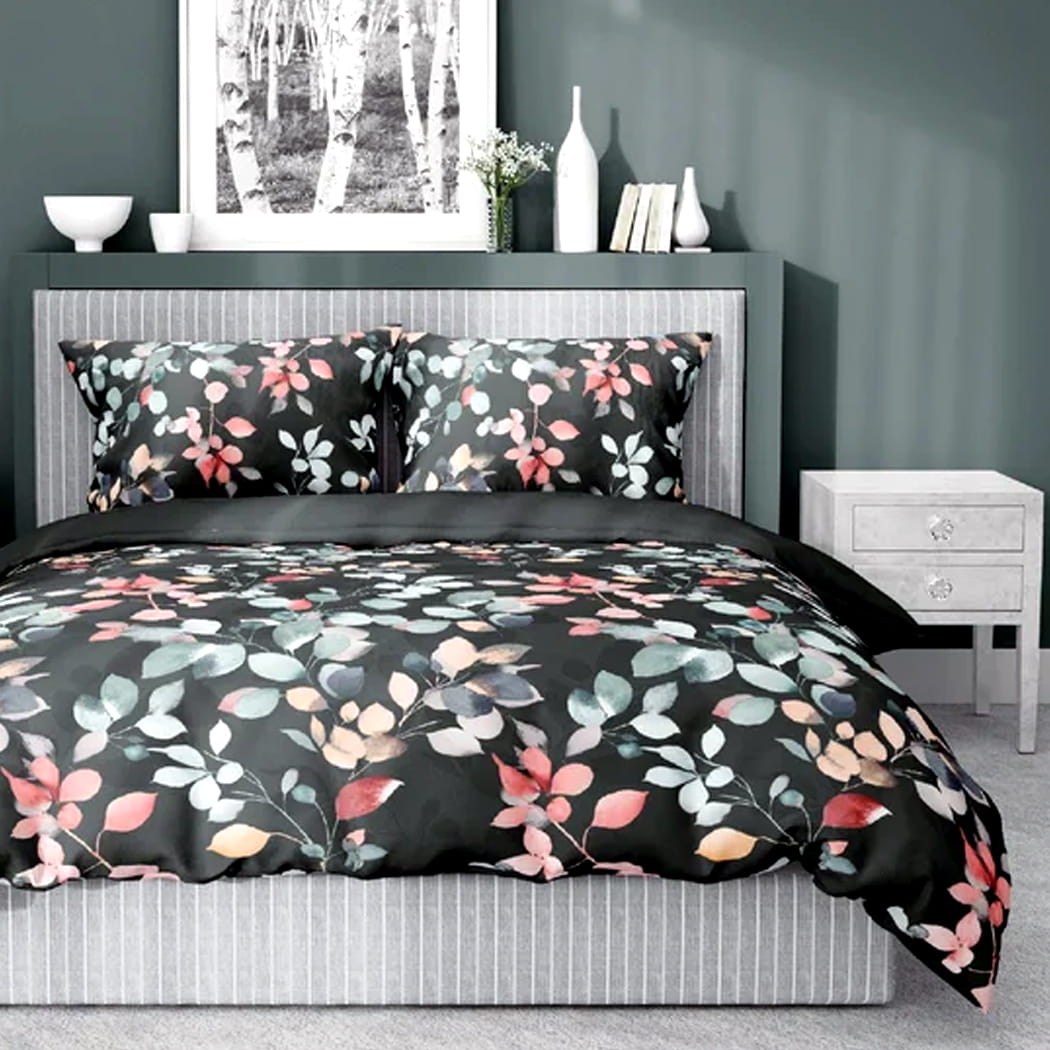 Elegancka pościel satynowa o czarnym tle, zdobiona subtelnym, akwarelowym wzorem pastelowych liści i kwiatów. Delikatne, rozmyte kolory tworzą spokojny i relaksujący klimat w sypialni. Wysokiej jakości satyna zapewnia miękkość i gładkość, gwarantując komfortowy i luksusowy sen. Pościel idealnie komponuje się z nowoczesnym i minimalistycznym wystrojem wnętrz, dodając im charakteru i elegancji.