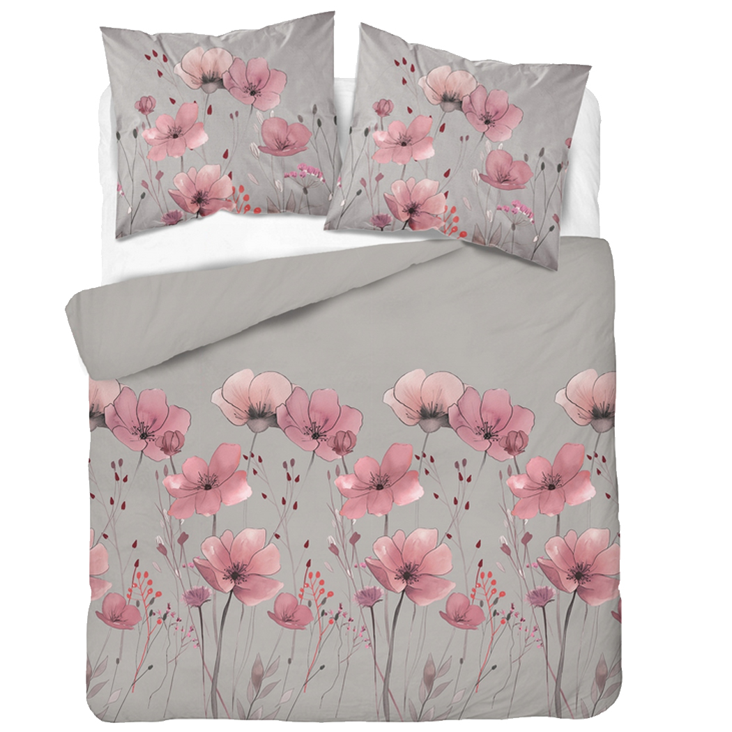 Pościel Satynowa 160x200 Szara w Różowe Maki i Polne Kwiaty - Detexpol 5493B