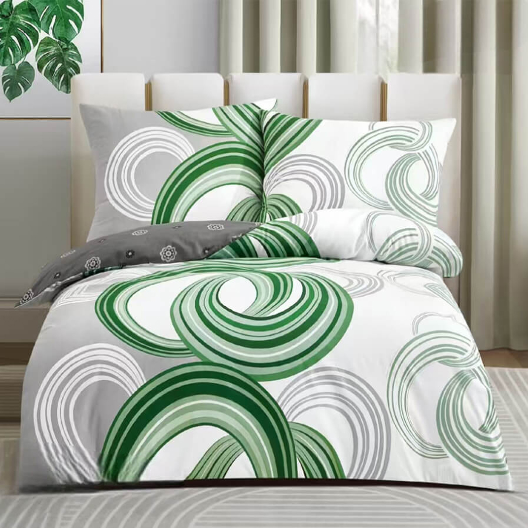 Design i kolorystyka: Wzór 8040 to dynamiczna kompozycja oparta na motywach pierścieni w odcieniach intensywnej zieleni, szarości i bieli. Ten nowoczesny deseń wprowadza do sypialni świeżość i charakter. Pościel zachowuje żywe kolory po wielokrotnym praniu, co świadczy o wysokiej jakości użytych barwników.