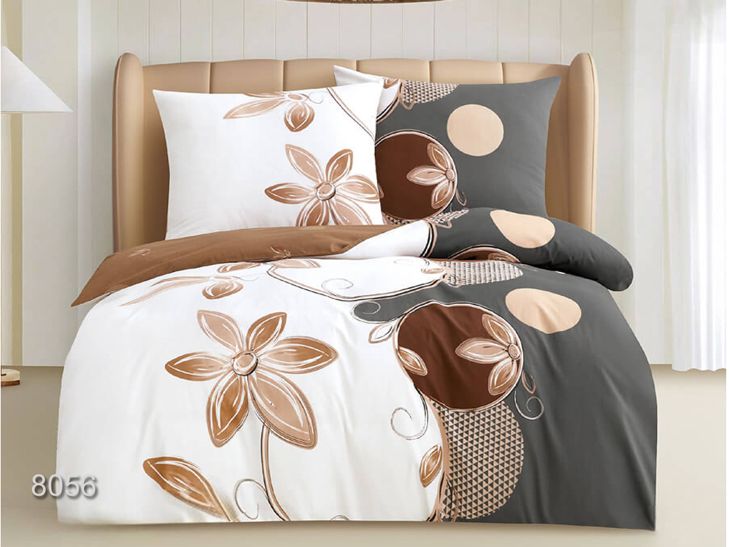 Design i kolorystyka: Wzór 8056 to dwustronna kompozycja charakteryzująca się dużymi, graficznymi kwiatami oraz geometrycznymi akcentami. Stonowana paleta barw opiera się na neutralnych odcieniach: głębokim brązie, ciepłym beżu i eleganckiej szarości na tle bieli. Ten nowoczesny motyw z nutą retro doskonale pasuje do wnętrz w stylu skandynawskim, nowoczesnym czy klasycznym. Trwałe barwniki zapewniają niezmienny wygląd pościeli przez długi czas.