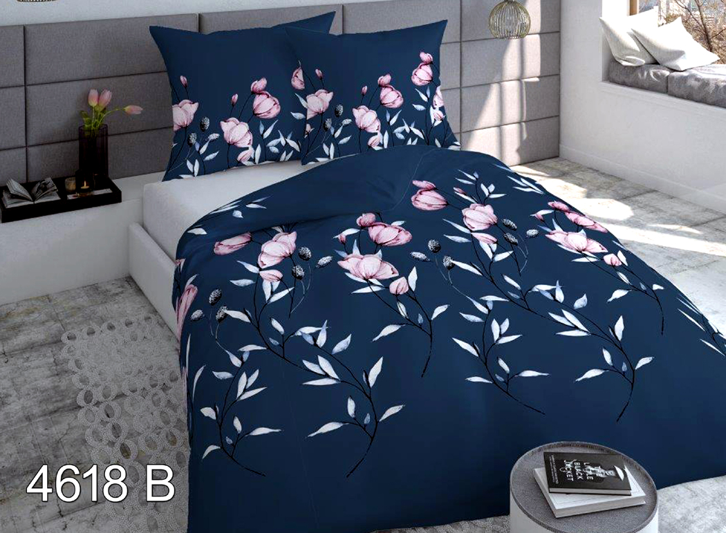 Wzór 4618B to idealna propozycja dla osób szukających pościeli, która łączy wyrazistą kolorystykę z delikatnym zdobnictwem. Komplet został wykonany z wysokogatunkowej bawełny o splocie satynowym, co nadaje tkaninie szlachetny połysk i sprawia, że jest ona niezwykle miła dla skóry. Na ciemnym, granatowym tle rozmieszczono smukłe gałązki pnące się ku górze. Zdobią je kielichy kwiatów w odcieniu brudnego różu oraz kontrastujące, białe i błękitne listki. Taki dobór barw sprawia, że wzór jest czytelny i bardzo efektowny. Materiał jest przewiewny, trwały i zachowuje głębię kolorów nawet po wielu praniach.