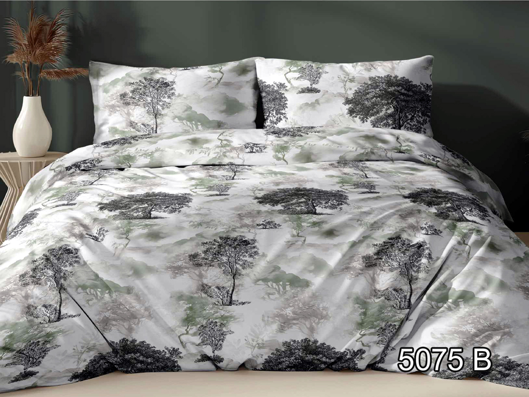 Wzór 5075B to propozycja dla osób ceniących szlachetne i ponadczasowe wzornictwo. Pościel została wykonana w 100% z bawełny o splocie satynowym, co gwarantuje wyjątkową miękkość materiału oraz subtelny, luksusowy połysk. Motywem przewodnim jest malowniczy pejzaż przedstawiający rozłożyste drzewa liściaste, wykonane w stylu precyzyjnego szkicu tuszem w odcieniach głębokiego grafitu i czerni. Całość kompozycji dopełniają delikatne, akwarelowe plamy w kolorze stonowanej, szałwiowej zieleni, które tworzą tło dla roślinności i nadają wzorowi głębi. Dzięki jasnej bazie i stonowanej kolorystyce, pościel doskonale wpisuje się w aranżacje typu klasycznego, skandynawskiego czy vintage, wprowadzając do wnętrza kojącą atmosferę lasu.