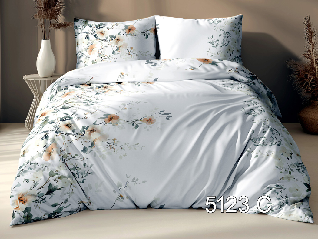 Wzór 5123C z prestiżowej linii Esclusiva to idealna propozycja dla osób ceniących subtelny luksus i minimalistyczny design. Pościel została wykonana z wysokogatunkowej satyny bawełnianej (100% bawełna), co gwarantuje jej jedwabistą gładkość, delikatny połysk oraz doskonałą cyrkulację powietrza podczas snu. Na śnieżnobiałym, rozświetlającym wnętrze tle, rozmieszczono zwiewny motyw roślinny. Delikatne, wijące się gałązki zdobią drobne kwiaty w ciepłych odcieniach brzoskwini i moreli, uzupełnione o listki w stonowanej, szałwiowej zieleni i szarości. Wzór nie jest jednolity – kwiaty zagęszczają się przy krawędziach, pozostawiając środek pościeli bardziej przejrzystym, co nadaje całości nowoczesnego, artystycznego wyrazu. To komplet, który doskonale sprawdzi się w jasnych sypialniach, dodając im przytulności w bardzo wyrafinowanym wydaniu.
