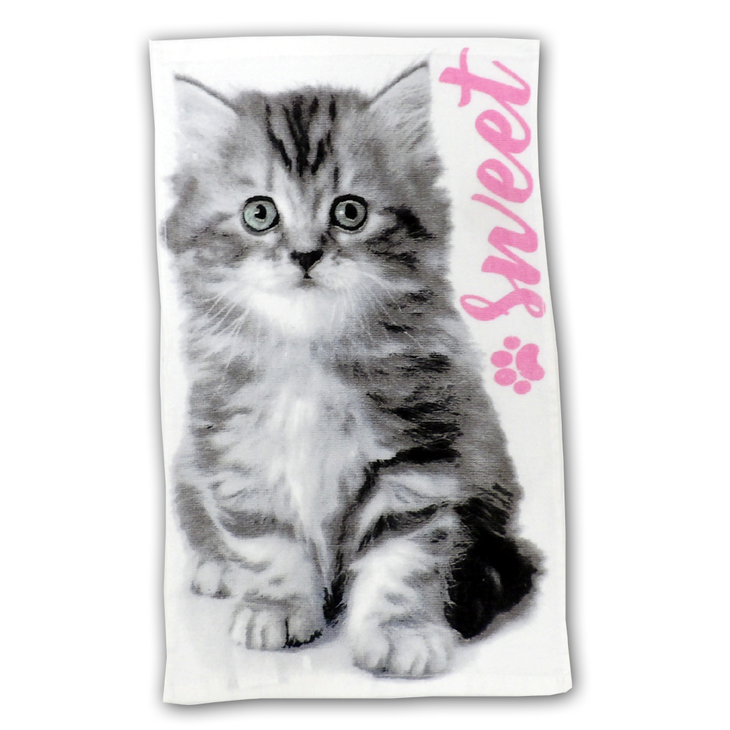 Ręcznik dziecięcy z motywem słodkiego, puszystego kotka, idealny dla każdego małego miłośnika zwierząt! Ręcznik o wymiarach 30x50 cm jest wykonany w 100% z wysokiej jakości bawełny, co zapewnia doskonałą chłonność, miękkość i delikatność dla wrażliwej skóry dziecka. Na białym tle, po lewej stronie, widoczna jest siedząca postać młodego kotka o szarej, pręgowanej sierści i dużych, niebieskich oczach. Kotek patrzy prosto przed siebie, a jego puszyste futerko sprawia, że wygląda niezwykle słodko. Po prawej stronie ręcznika, pionowo, znajduje się różowy, stylizowany napis "Sweet" z dodatkowym symbolem kociej łapki. Ten praktyczny i łatwy w pielęgnacji ręcznik doskonale sprawdzi się w przedszkolu, na wycieczce, na basenie czy w domowej łazience, zachęcając dziecko do codziennej higieny w towarzystwie uroczego pupila.Ręcznik 30x50 parametry: